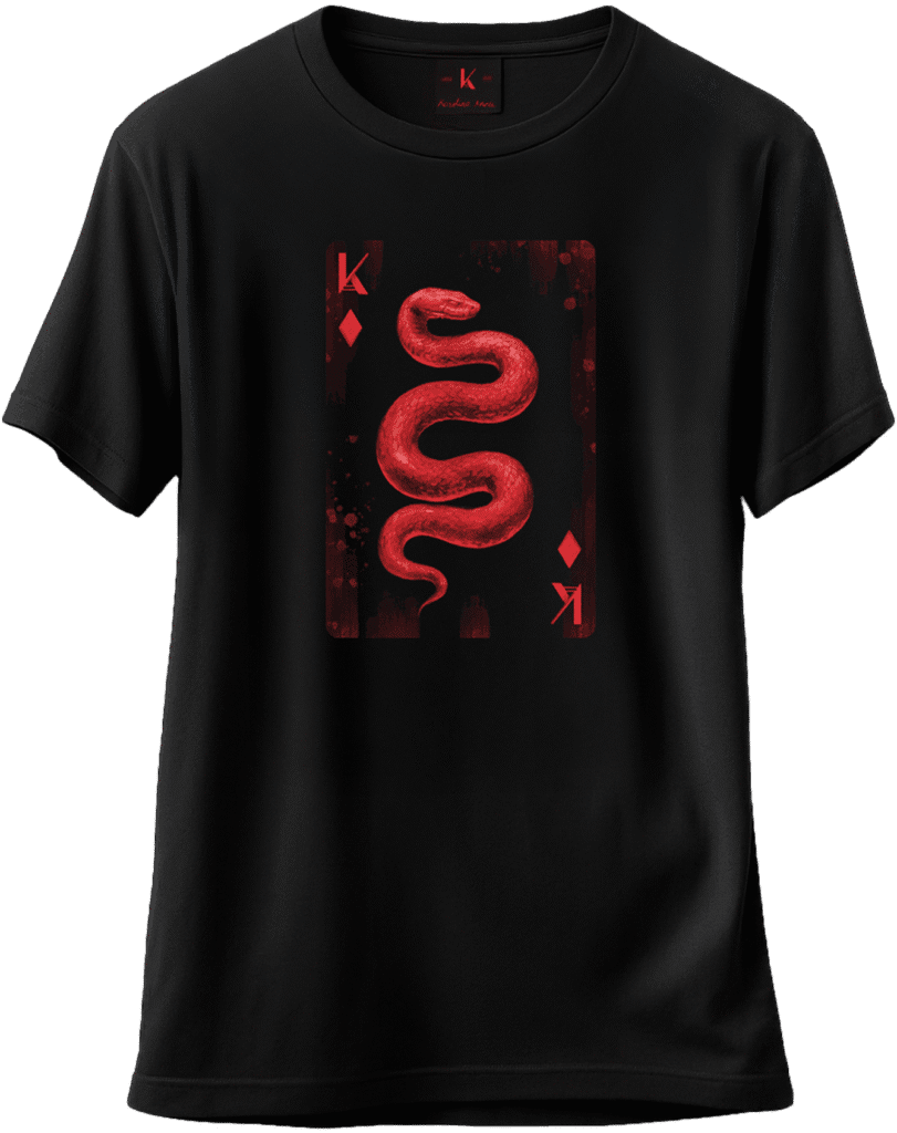 Dla fanów true crime, którzy wolą bardziej tradycyjny, mroczny klimat, przygotowałam klasyczne czarno-czerwone zestawienie. W tym projekcie nawiązałam do symboliki węża, która w kontekście kryminalnym jest dość jednoznaczna. W mitologiach wąż symbolizuje śmierć, zło i chaos – czyli ciemną stronę rzeczywistości, która często pojawia się w moich filmach. Podobnie jak w przypadku koszulki z Temidą, motyw został zamknięty w formie karty do gry. Tym razem z dodatkowym odniesieniem w postaci „karo”!